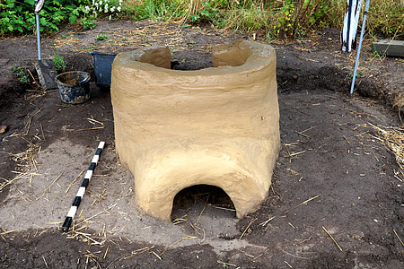 Studierende des Instituts für Provinzialrömische Archäologie der Universität Freiburg stellen mit tatkräftiger Unterstützung der ehrenamtlichen Helfer des Arbeitskreises „Gallo-Römisches Leben Lahr-Dinglingen“, nur wenige Meter vom einstigen Fundort entfernt, am Wochenende, 10. und 11. August 2019, den Töpferofen in der Römeranlage fertig.
