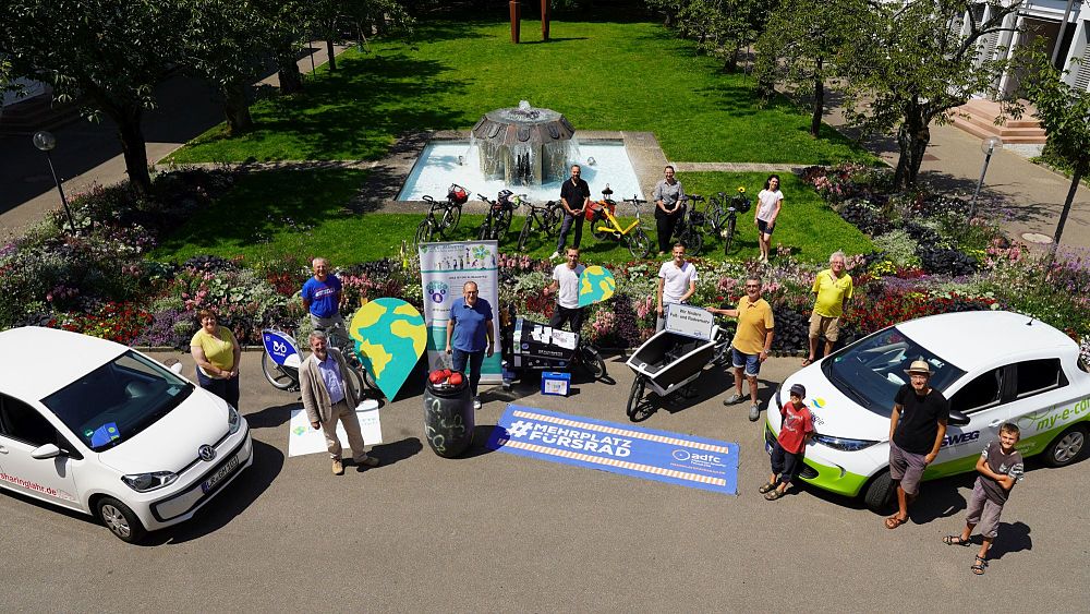 von links nach rechts: Helen Körfges, von Carsharing „Gemeinsam Mobil Lahr“ / Bürgermeister Tilman Petters / Siegfried Walter vom ADFC Offenburg / Stadtrat Sven Täubert (Bündnis 90/Die Grünen) / Initiator der Klimawette, Dr. Michael Bilharz / Stadtrat Frank Himmelsbach (Bündnis 90/Die Grünen) / Klimaschutzmanagerin, Madeleine Krol / Martin Stehr vom Stadtplanungsamt, zuständig für Verkehr, Mobilität, Radwege, Pedelec-Verleihsystem und Rheintalbahn / Stadtrat Eberhardt Roth (Freie Wähler) / Katrin Kopp, Vorstandssprecherin Die Grünen Lahr / Helmut Schönberger, ADFC Kreisvorsitzender / Jonas Meßmer, Regionalmanager stadtmobil my-e-car mit Kindern