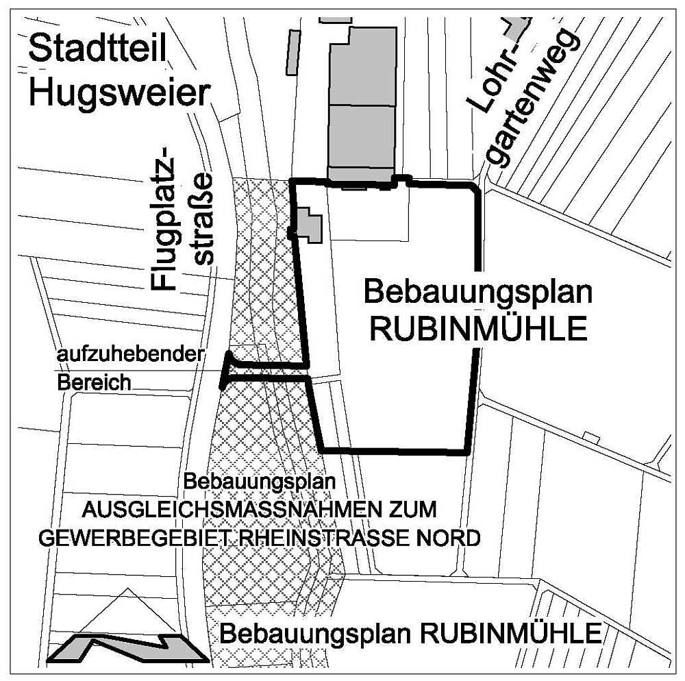Der Gemeinderat der Stadt Lahr hat in seiner öffentlichen Sitzung am 02. Mai 2016 die Satzung für den Bebauungsplan Rubinmühle, Stadtteil Hugsweier und die Satzung über die hierzu erlassenen örtlichen Bauvorschriften beschlossen. Der Geltungsbereich der beiden Satzungen ist auf dem beigefügten Bestandsplan ersichtlich. Mit der Planaufstellung ist auch eine Teilaufhebung des angrenzenden Bebauungsplanes Ausgleichsmaßnahmen zum Gewerbegebiet Rheinstraße Nord (rechtsverbindlich am 01. Mai 1997) verbunden.