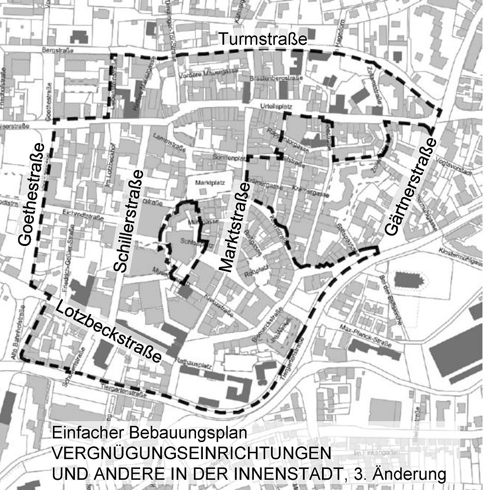 Der Gemeinderat der Stadt Lahr hat in seiner öffentlichen Sitzung am 23. März 2020 die Satzung für den Bebauungsplan Vergnügungseinrichtungen und andere in der Innenstadt, Dritte Änderung beschlossen. Der Geltungsbereich der Satzung ist auf dem beigefügten Bestandsplan ersichtlich.
