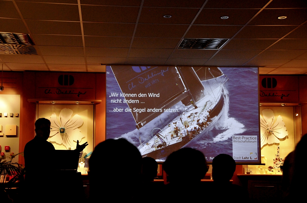Bernd Dahlinger nahm die Besucherinnen und Besucher des Best-Practice-Wirtschaftsforums in seinem Vortrag mit auf einen Segeltörn, der in den 1980er-Jahren begonnen hat, zu der Zeit, als das Dahlinger-Boot voll im Wind stand. Kraftvoll segelte man auf Kurs. Doch sehr bald geriet die Firma in ein schwieriges Seegebiet mit aufkommenden Gegenwinden. Übertragen auf den Firmenalltag bewegte man sich Schritt für Schritt in eine Situation, in der man bald erkennen musste, dass eine Restrukturierung und Transformation der Firma unumgänglich war, um das Unternehmen in eine gesicherte Zukunft führen zu können. Hierzu war kein Drehbuch verfügbar, dieses musste speziell von der Firma für diesen Weg geschrieben werden, wobei manche Passagen im Vorhinein noch gar nicht bekannt waren. Es gab Überraschungen, die dem Unternehmen auf dem Weg begegneten, und welche die Transformation komplizierten und in die Länge zogen. Dabei musste der Kurs immer wieder angepasst werden.