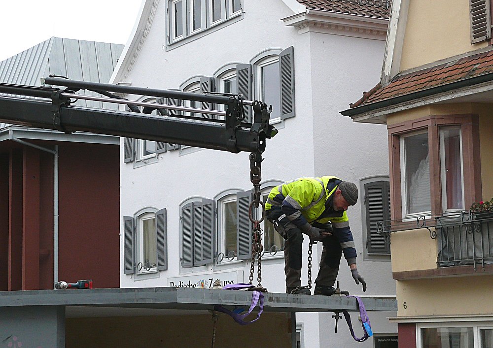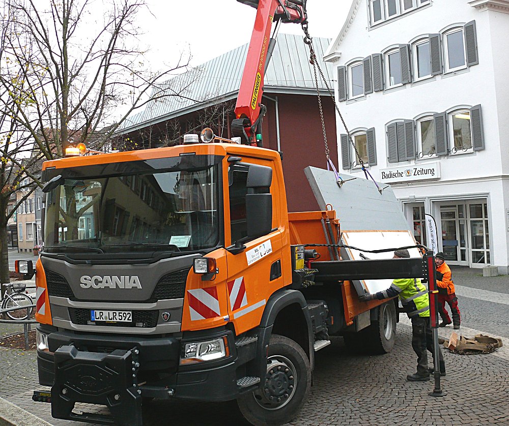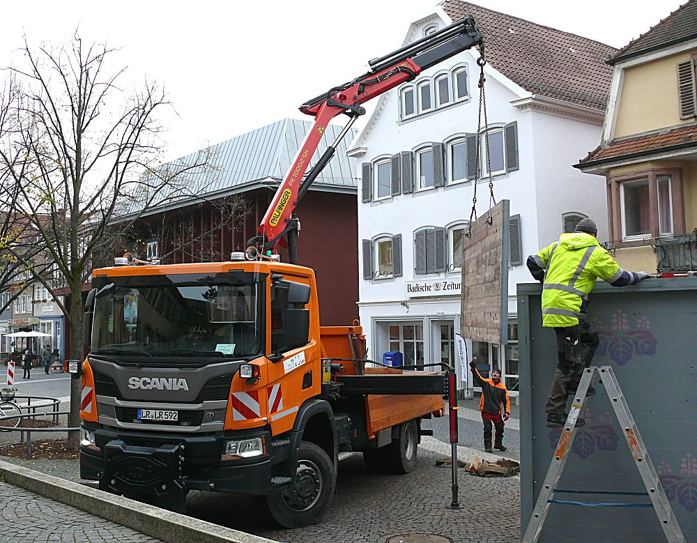 Heute sind die letzten Zeugen der Chrysanthema 2019 abgebaut worden. Mitarbeiter des Lahrer Bau- und Gartenbetriebs (BGL) haben die Holzhäuschen auf dem Urteilplatz demontiert und auf einen LKW verladen.