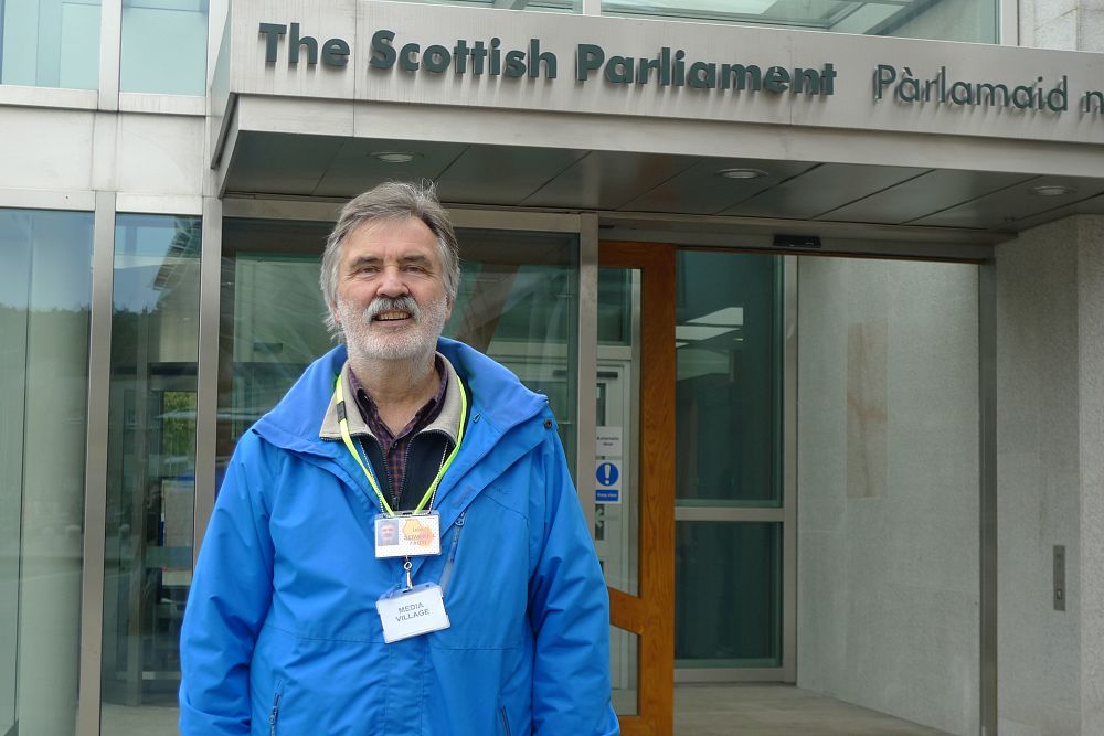 Mann mit grau-melierten Haaren, grauem Schnauzbart und grauem 7-Tage-Vollbart, trägt blaue Jacke und steht vor einem Gebäude mit der Aufschrift "The Scottish Parliament".
