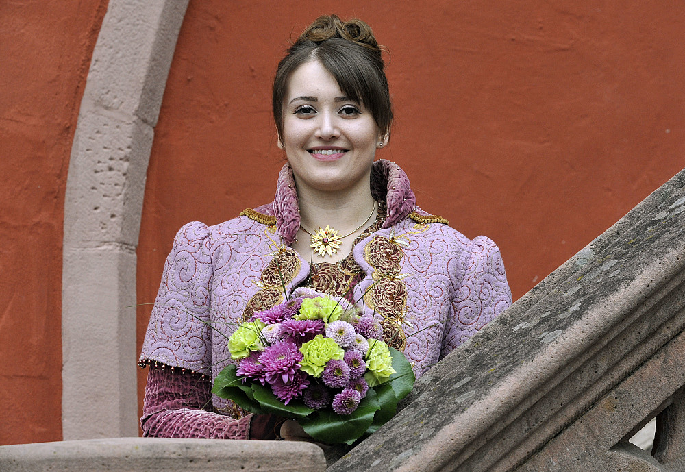 Lorena Harter präsentiert sich als Chrysanthemenkönigin im königlichen lila Gewand auf der Treppe des Alten Rathauses.