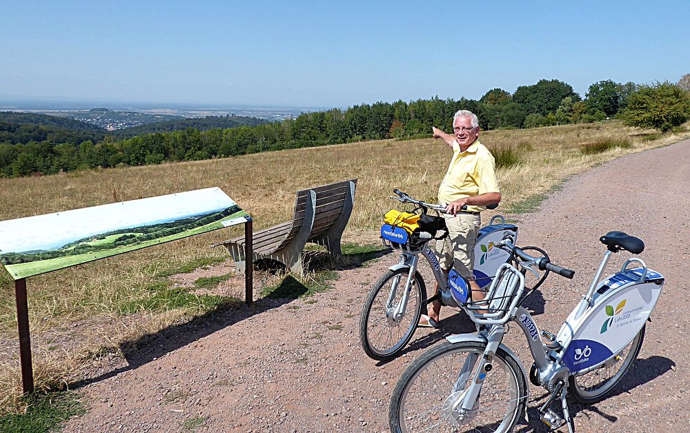 Klimaschutzmanager Dr. Michael Dutschke nahm die Herausforderung an und radelte bei 30 Grad im Schatten mit Schönberger gemeinsam auf den Langenhard, den höheren der beiden Lahrer Hausberge, der auf 450 Metern über Meeresspiegel eine Panoramasicht über die Rheinebene bietet. Sanft unterstützt durch den Elektroantrieb, erreichten die beiden (fast) ohne Schieben den Windpark auf dem Bergkamm und das Gasthaus Eiche auf dem direkten, teils holprigen Schotterweg. Die eigentlich als City-Bikes konzipierten Leih-Pedelecs, schlugen sich dabei tapfer im Gelände.