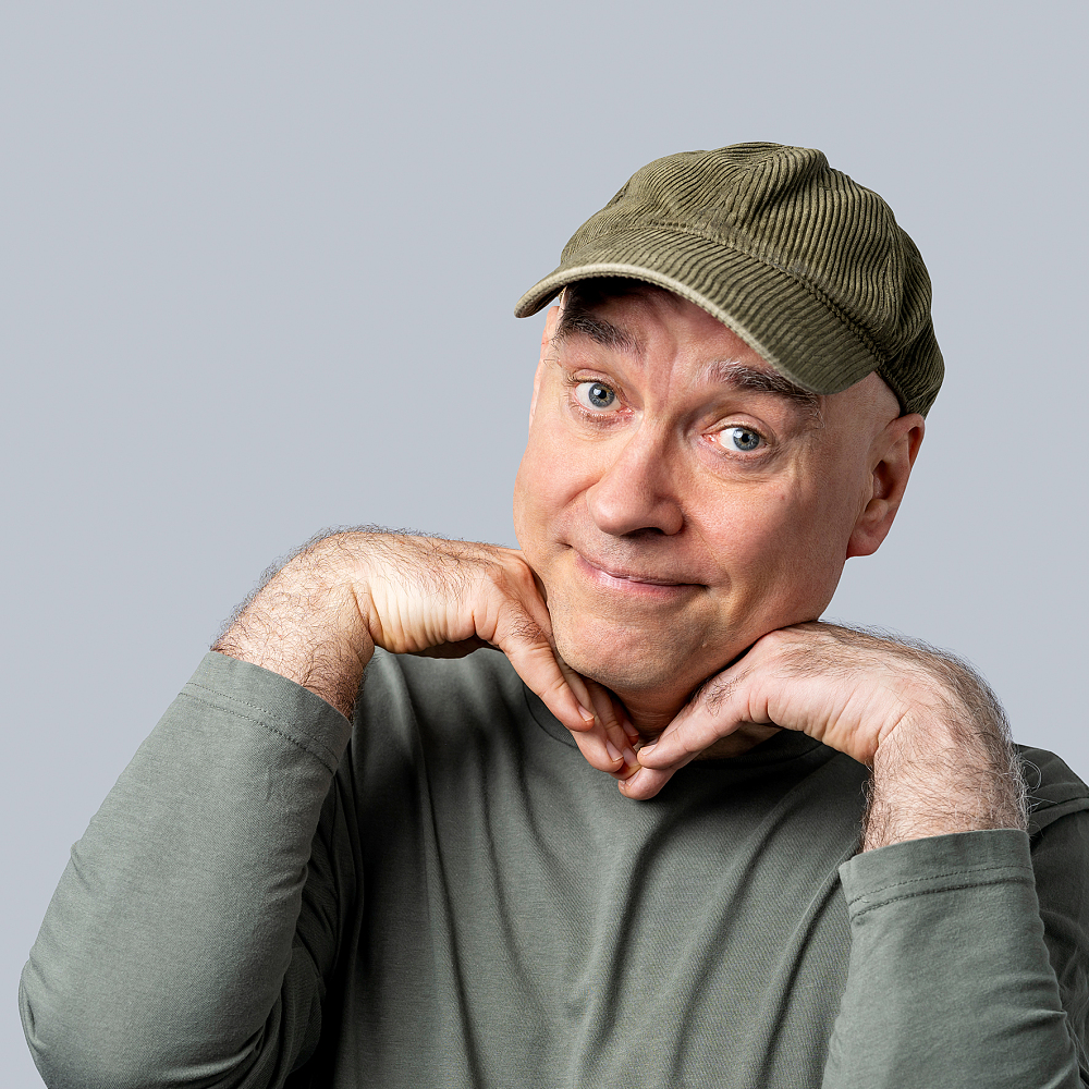 Portrait von E HG Butzko, er stützt seinen Kopf auf den Händen ab und grinst in die Kamera