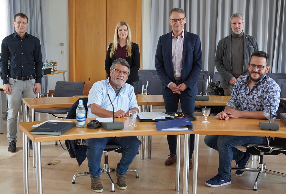 Vertragsunterzeichnung für das Haus am See: Vorne: Lothar und Marc Scheer, Hinten; Stefan Martinelli (Gebäudemanagement Stadt Lahr), Silke Kabisch (Leiterin Gebäudemanagement), Oberbürgermeister Markus Ibert und Bürgermeister Tilman Petters