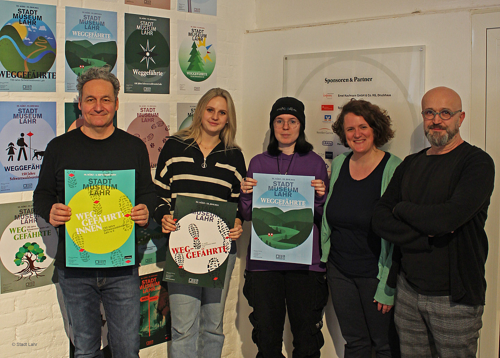 Freuen sich über das gelungene Projekt (von links): Andreas Kaufmann, 1. Vorsitzender des Schwarzwaldvereins Lahr, Lara Gielen und Sina Marchioni, Schülerinnen des Berufskollegs Grafik-Design an der Gewerblichen Schule Lahr, Silke Höllmüller, Stadtmuseum Lahr, und Jürgen X. Albrecht, Grafikdesigner und Lehrer im Berufskolleg Grafik-Design. Es fehlt: Veronique Hummenscheimer.