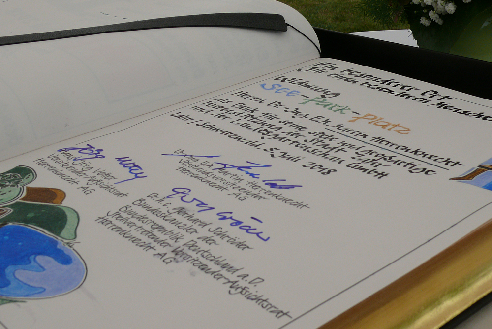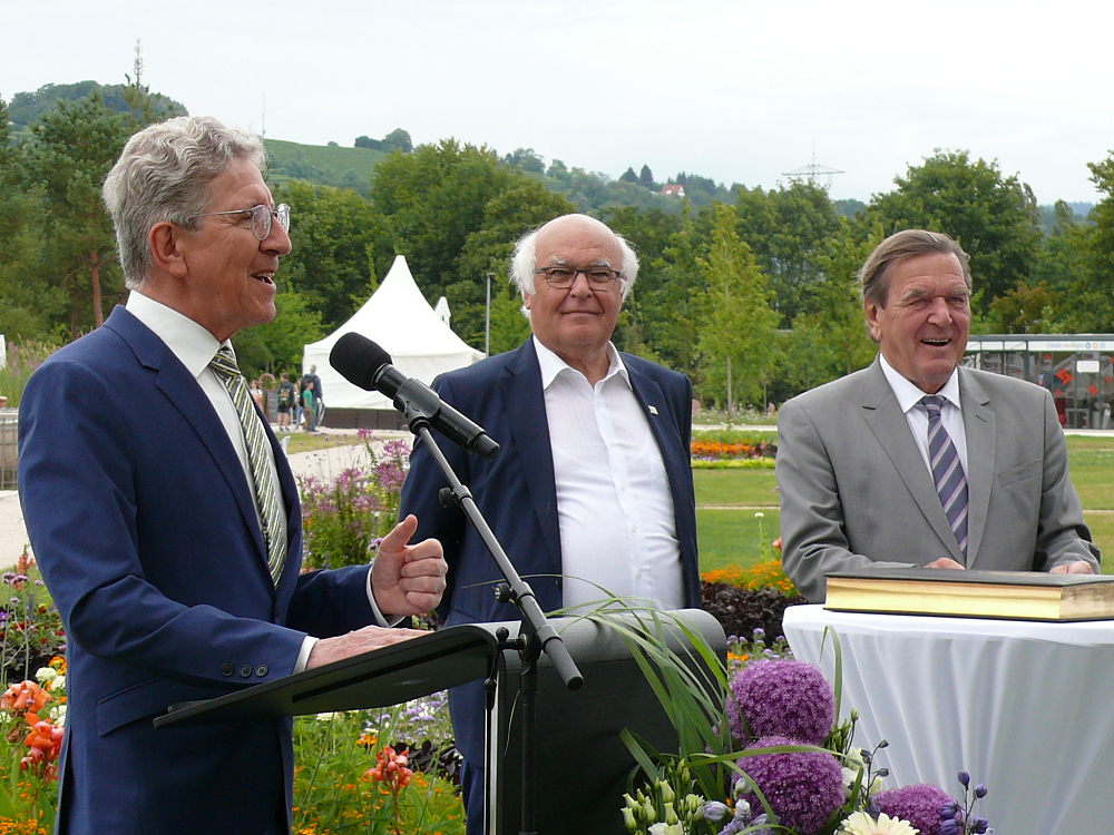 Für seine jahrelange stetige Unterstützung wurde dem Unternehmer ein besonderer Ort mit Bäumen und Bank im Seepark der Landesgartenschau gewidmet. Als Ehrengast der Feierstunde sprach Alt-Bundeskanzler und stellvertretender Aufsichtsratsvorsitzender der Herrenknecht AG Gerhard Schröder.
