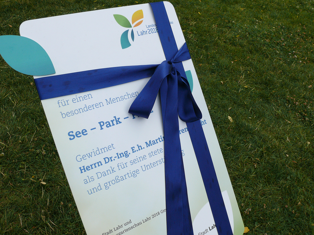 "Sapperlott, bin ich platt. Ich habe in meinem Leben schon viele Auszeichnungen und Ehrungen erhalten, aber noch nie so eine Widmung an einem so frischen und schön angelegten erholsamen Ort“, bedankte sich der Schwanauer Unternehmer Dr.-Ing. E.h. Martin Herrenknecht in launigen Worten für ein besonderes Geschenk der Stadt Lahr und der Landesgartenschau GmbH am Donnerstag.