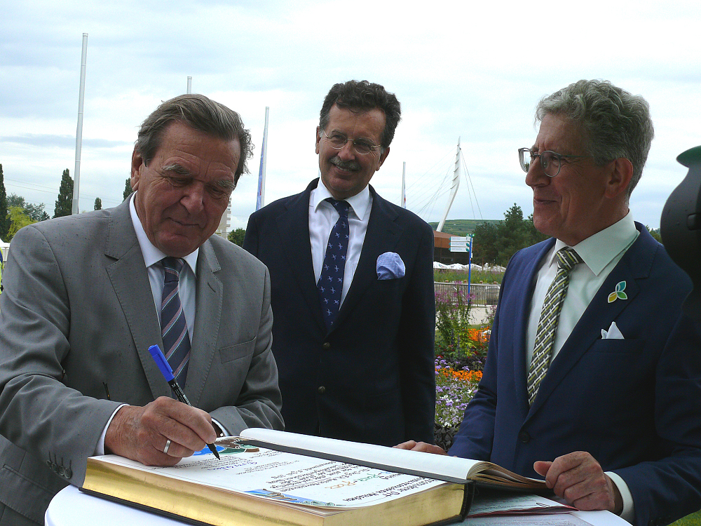 Gemeinsam mit Gerhard Schröder und Hans-Jörg Vetter, Aufsichtsratsvorsitzender der Herrenknecht AG, trug sich Martin Herrenknecht in das goldene Buch der Stadt Lahr ein.