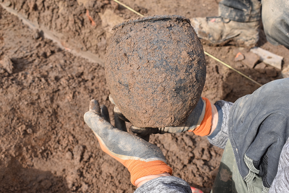 Bergung einer Urne auf der Grabung Leopoldstraße