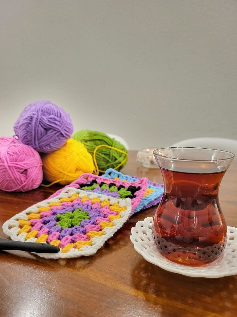 Auf dem Bild sieht man einige bunte Wollknäuel, gehäkelte Topflappen und ein Glas Tee