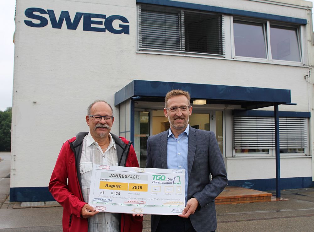 Der Gewinner und Wolfgang Bumann stehen vor dem SWEG - Gebäude mit einer überdimensionalen Fahrkarte in den Händen und lächeln.