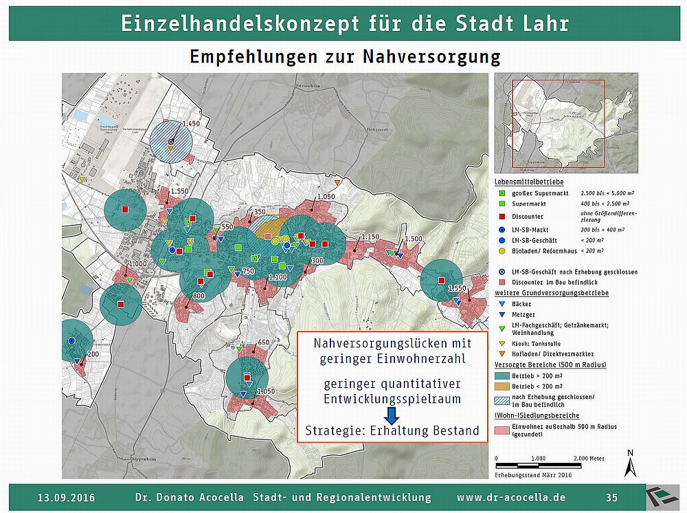 - Einen wichtigen Teil der Lahrer Einzelhandelsentwicklung kann die Stadt selbst beeinflussen – durch Festlegung und Durchsetzung richtiger Standorte, Sortimente und Größen. Mit dieser Steuerung können negative Folgen wie (Grund-)Versorgungslücken, Leerstände in der Innenstadt oder Qualitätsverluste (Trading down) minimiert werden. Erfolgreiche Beispiele aus anderen Städten bestätigen diese Strategie.