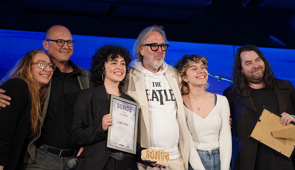 Lisette Cardozo (Dritte von links) mit der Jury des Wettbewerbs (von links): Singer-Songwriterin Michelle Leonard, Andreas Küchle vom Stiftungsrat der Stiftung Bildung und Soziales der Sparda-Bank Baden-Württemberg, Prof. Udo Dahmen, bis 2023 Künstlerischer Direktor der Popakademie, Songwriterin und Sängerin der Band „ok.danke.tschüss“ Eva Sauter und Derek von Krogh, Künstlerischer Direktor und Geschäftsführer der Popakademie