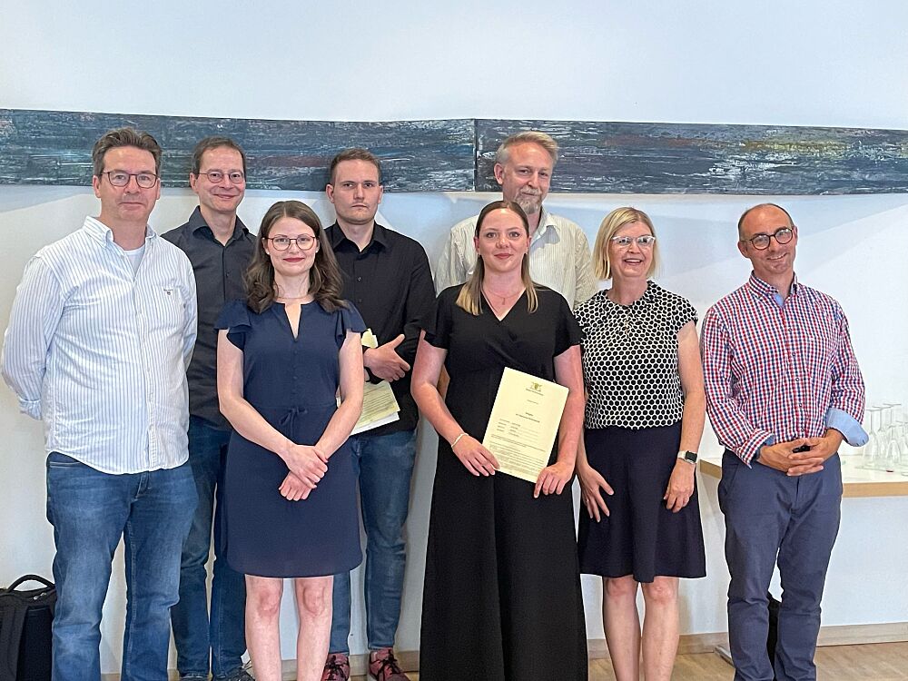 Die erfolgreichen Absolventen des Abendgymnasiums: Michael Losch, Dr. Roland Schneider (Lehrer) mit den Abiturienten Maria Brosamer, Julian David Kaufmann und Laila Maria Schmidt sowie Patrick Berg, Kathrin Lang (Lehrer), Marc Rabenmüller (Leiter des Abendgymnasiums).