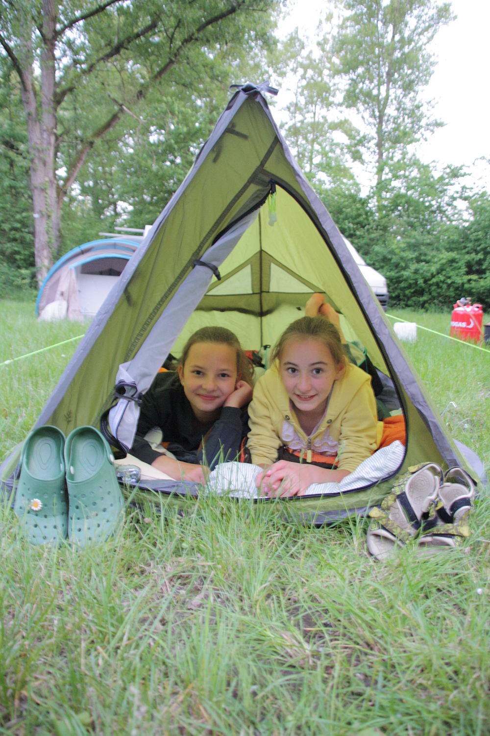 Das Bild zeigt zwei Mädchen, die bei den Kanu-Abenteuer-Tagen für Mädchen liegend aus einem Zwei-Personen-Zelt schauen.