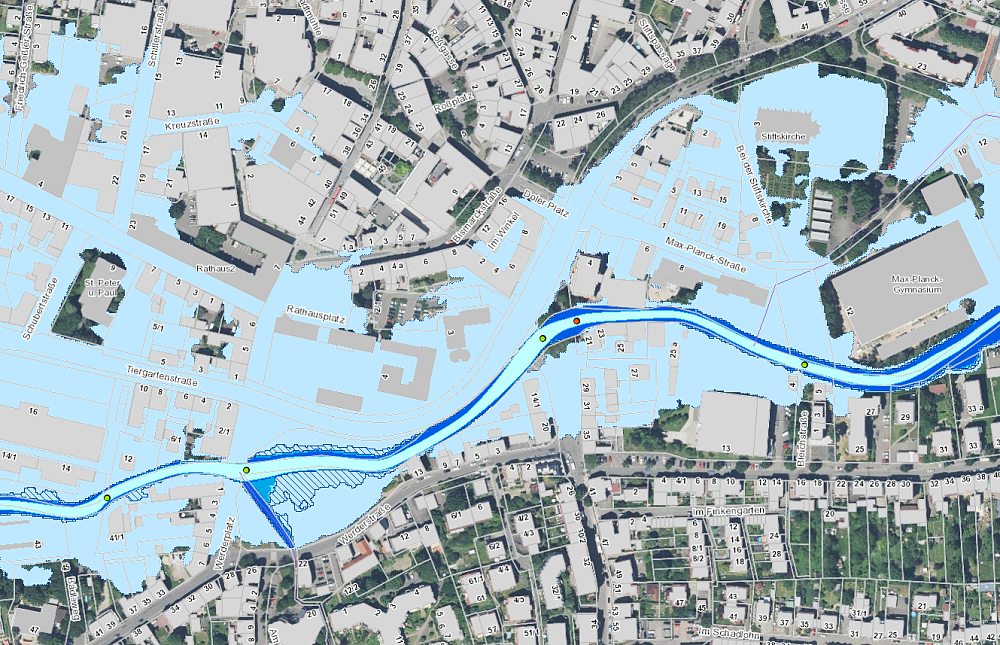 Auszug aus der Hochwassergefahrenkarte mit der Darstellung von Extremhochwasser, das durch ungewöhnliche, extreme Niederschlags- und Abflussereignisse, aber auch durch Rückstau aufgrund von blockierten Brückendurchlässen zu einem extremen Wasserstand führen kann und sehr selten auftritt. Technische Hochwasserschutzanlagen bieten hier in der Regel keinen Schutz, da ein solches Hochwasser das Bemessungsereignis für die Anlagen übersteigt. Daher treten bei einem Extremhochwasser die größten Überflutungsflächen auf. Diese Flächen sind im hellsten Blauton dargestellt.
