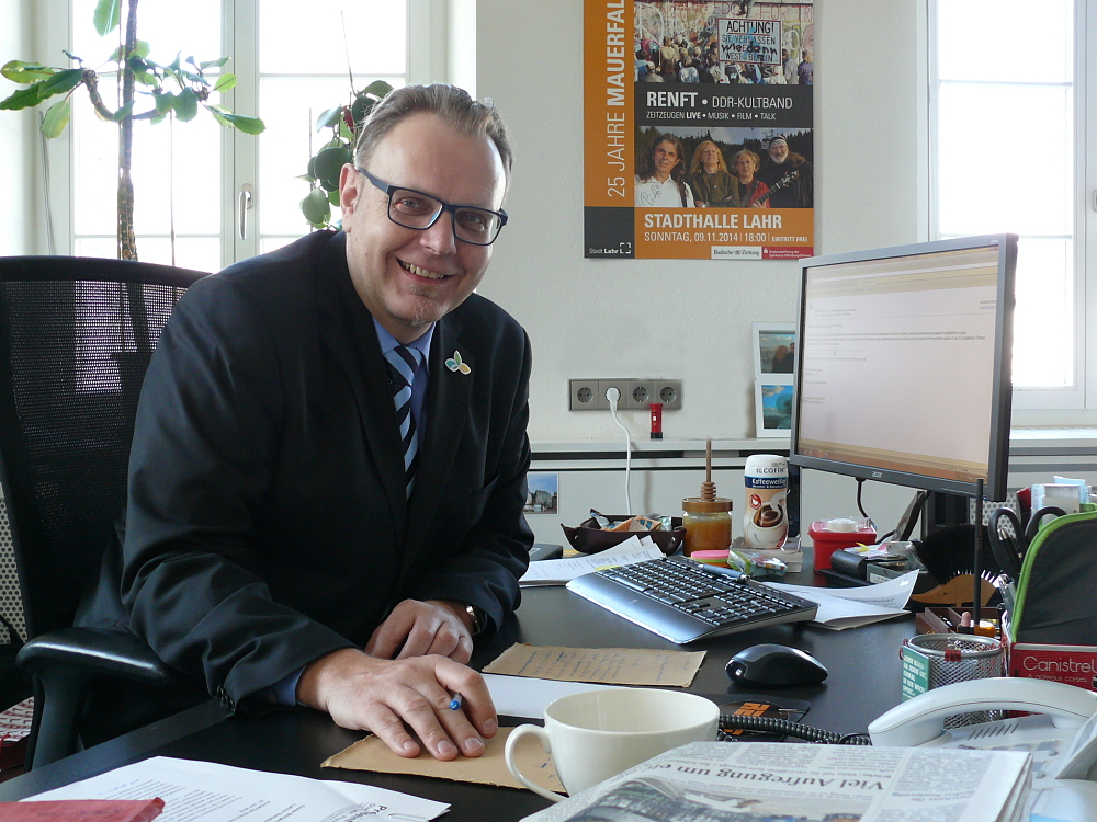 Erster Bürgermeister Guido Schöneboom am Tag nach der Wiederwahl an seinem Schreibtisch. Er trägt ein blaues Hemd, eine gestreifte Krawatte und einen dunklen Anzug mit einem Anstecker der Landesgartenschau Lahr 2018 und lacht in die Kamera.