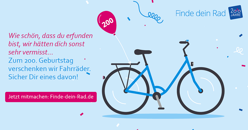 Zum Geburtstagfest des Fahrrads verschenkt die Stadt Lahr zwischen dem 25. Juli 2017 und dem 28. Juli 2017 insgesamt drei Jubiläumsfahrräder. Um eines der Jubiläumsfahrräder zu ergattern, muss der Teilnehmer bei einer interaktiven Schatzsuche das dazugehörige Schloss finden. Auf der Kampagnenwebseite www.finde-dein-rad.de werden Hinweise veröffentlicht, die spielerisch zum Versteck des Schlosses in der Stadt Lahr führen. Wer dort zuerst ankommt, gibt seine Kontaktdaten online ein und erhält so den Code zum Öffnen des Schlosses. Gelöste Rätsel sind auf der Kampagnenwebseite nicht mehr spielbar, damit niemand umsonst auf die Suche geht. Glückliche Finder können das Fahrradschloss bei der Stadtverwaltung gegen ein Jubiläumsfahrrad eintauschen.