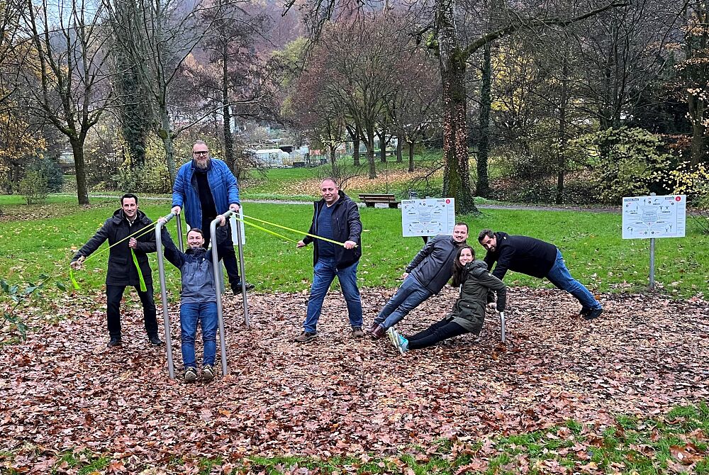 Sechs Männer und eine Frau auf den Outdoor-Sportgeräten im Lahrer Rosenpark.
