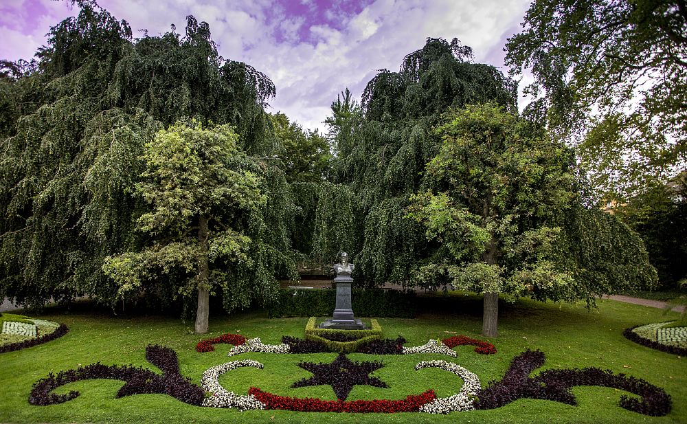 Zu sehen ist eine kunstvoll angelegte Blumenrabatte in weiß, rot und dunkelrot, am Fuße der Bismarck-Büste im Stadtpark Lahr. Dahinter mächtige, alte Bäume.