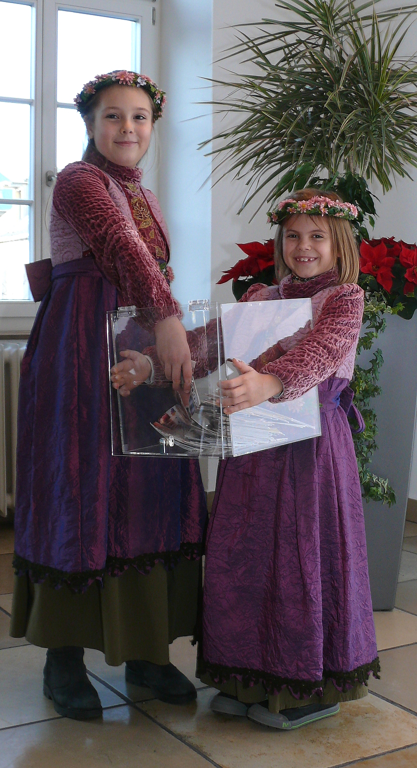 Zwei Mädchen in violettfarbenen Kleidern mit Blumenkränzen auf dem Kopf. Ein Mädchen hält einen transparenten Behälter mit Postkarten, das andere Mädchen zieht Postkarten daraus.