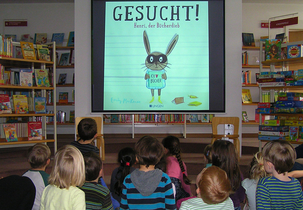 „Lesen macht Spaß!“ - aber Lesefähigkeit ist keine Selbstverständlichkeit und ein möglichst früher Umgang mit Sprache, mit Bild und Schrift und mit Büchern, ist für die Entwicklung von Kindern von großer Bedeutung. Er ist sowohl ideale Sprachförderung als auch eine der Grundlagen für einen späteren Lese- und Lernerfolg. Im gemeinsamen Gespräch zeigte sich, dass die Vorbereitungen für den ersten Schultag schon weit vorangeschritten sind: Schulranzen warten auf ihren Einsatz und Vorstellungen, wie die noch zu bastelnde Schultüte aussehen soll, sind zahlreich vorhanden. In vielen Fällen durften die Kinder zudem schon die künftige Schule besuchen. Dass man dort auch mal so richtig toben darf, und sei es nur während der Pausen, da sind sich die kommenden Erstklässler ganz sicher. Bücher wie „Neues vom Ernst des Lebens“ oder die Geschichte „Ich komm bald in die Schule“ zeigten den Kindern, dass ihre eigene, aktuelle Situation, geprägt von Freude, zeitweise aber auch Unsicherheit vor dem neuen Lebensabschnitt, in vielen Kinderbüchern thematisiert wird und dass das Vorlesen dieser Geschichten sehr ermutigend bzw. tröstlich sein kann. Um die Vorfreude aufs selber Lesen zu bestärken, wurde zum Schluss der Veranstaltung gemeinsam das Bilderbuchkino „Gesucht! Henri, der Bücherdieb“ angesehen: