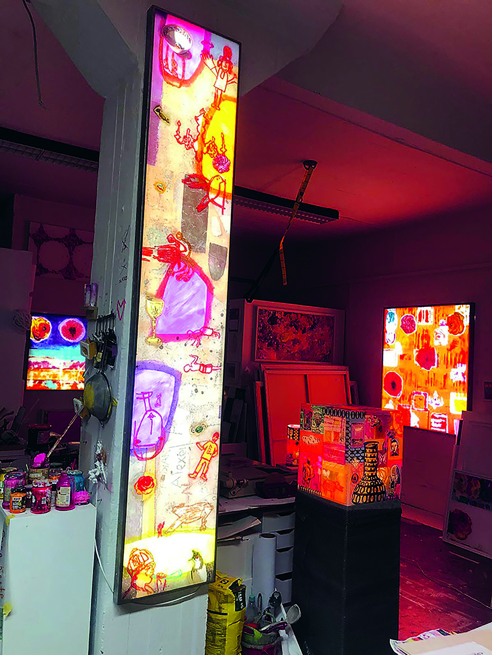 Während längerer Autofahrten wurde der Künstlerin bereits in ihrer Kindheit bewusst, dass verschiedene Arten von Licht ganz unterschiedliche Gedanken hervorrufen. Während die Überlegungen tagsüber eher zielgerichtet verlaufen, verbreitert sich der Gedankenstrom bei Einbruch der Dunkelheit und in der Nacht. Fasziniert von dieser Erkenntnis, spürt sie diesem Aspekt seit rund 30 Jahren in ihren Lichtobjekten, Lichtbildern und in ihrer Hinterglasmalerei künstlerisch nach. Gegenständliche und abstrakte Bildelemente, collageartige Abschnitte und kindliche Strichzeichnungen generieren dabei im Wechsel von natürlichem und künstlichem, hellem und dunklem Licht „Zeitstimmungen", die für einen vergleichbaren Rhythmus und Wandel stehen.