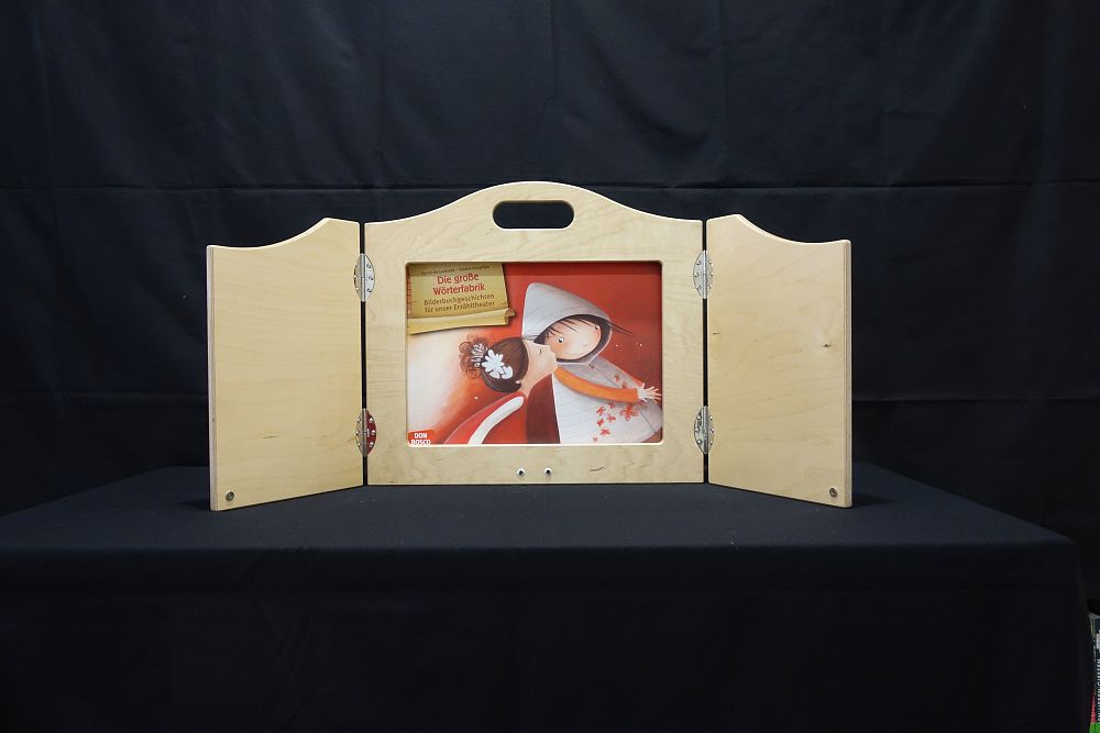 In einem aufstellbaren Holzrahmen mit zwei aufklappbaren Flügeltüren stecken Bildtafeln, die im Verlauf der Geschichte einzeln zur Seite gezogen werden und so den Blick auf das jeweils nächste Bild freigeben. Nähe und Blickkontakt des Erzählers zum Publikum schaffen eine besondere Atmosphäre und üben ihren eigenen Zauber aus.