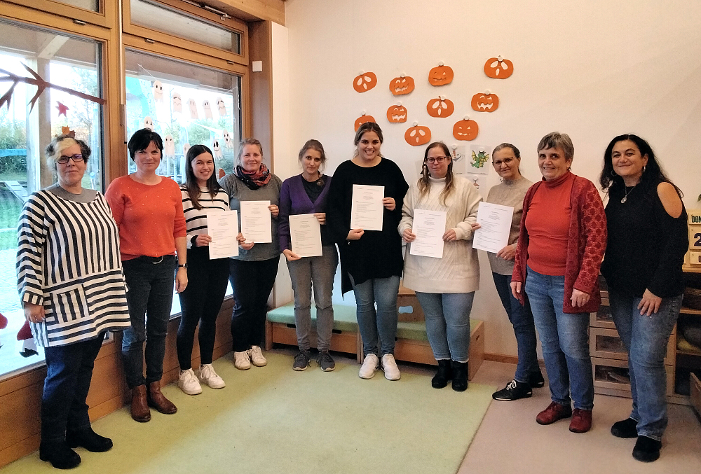 Die Fortbildung erfolgreich abgeschlossen haben: Marie Schweizer, Kita Alleestraße; Tristan Gute, Kita Am Schießrain; Anna-Maria Beck, Kita im Bürgerpark; Elvira Koch und Jasmin Holzapfel, Martinskindergarten; Beatrice Ziegler, Kita Max-Planck-Straße; Lydia Klein, Kita Bottenbrunnenstraße; Luisa Möller, Kita Sancta Maria; und Eray Kanli, Kita Lotzbeckstraße.