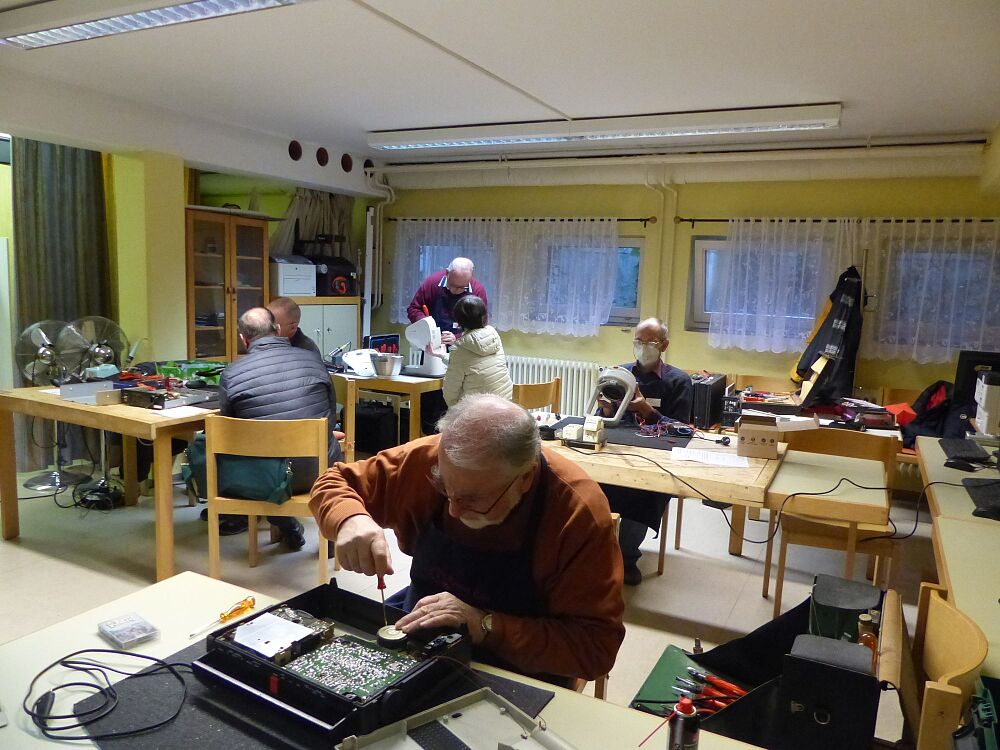 In einem Raum sitzen an verschiedenen Tischen Menschen, die Dinge reparieren.