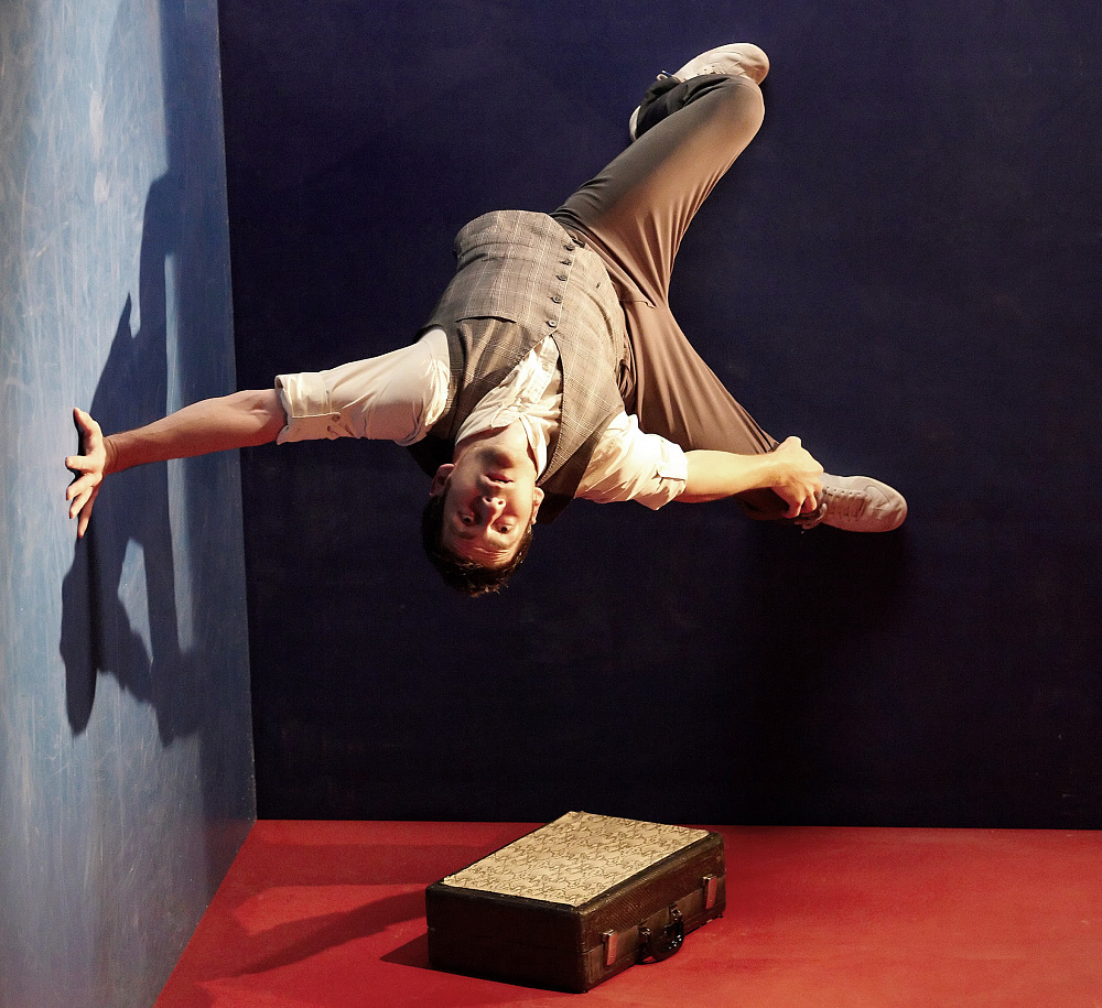Leo schwebt an der Wand, dreht aberwitzige Pirouetten oder wirft einen Hut in die Luft, der auf ihn zurückplumpst, als wäre sein Körper das Gravitationszentrum des Universums. Leo nutzt die Technik der Videoprojektion um die Regeln der Realität zu brechen und physikalische Quantensprünge zu vollziehen.