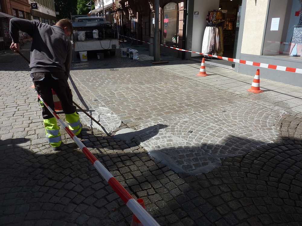 Die Stadt Lahr setzt ab Montag, 27. Juni 2022, eine Maßnahme für mehr Barrierefreiheit in der Innenstadt um: Das mittig in der Marktstraße verlegte Natursteinpflaster wird mithilfe eines neuen, auf Kunstharz basierenden Fugenmaterials so überarbeitet, dass eine nahezu ebene Oberfläche entsteht.