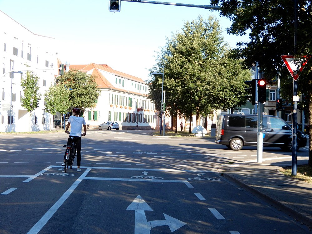Ebenso vermeidbar sind blockierte Aufstellflächen an Kreuzungen. Der Radfahrer gerät aus dem Blickfeld der Fahrzeugführer und so auch schnell in Vergessenheit. An einigen Ampelkreuzungen in Lahr, wie beispielsweise am Doler Platz oder am Friedrich-Ebert-Platz, wurden deshalb separate Aufstellflächen markiert (siehe Foto). Radfahrer können sich dort vor den anderen Fahrzeugen aufstellen und befinden sich so im Blickfeld der Autofahrer.