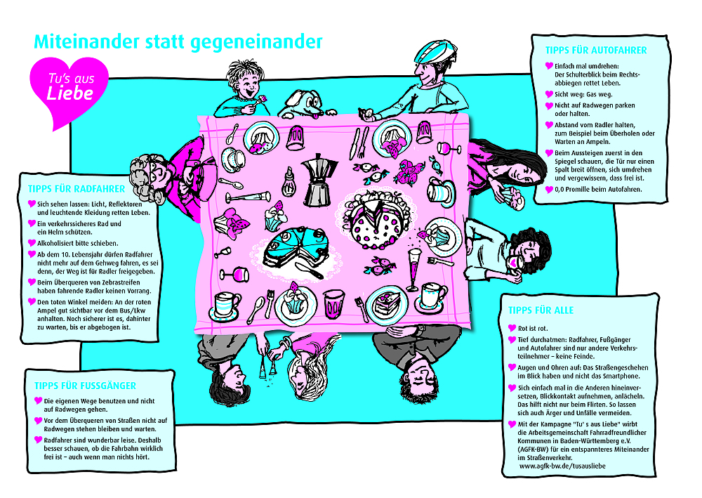 Die Stadt Lahr ist seit November 2014 Mitglied in der Arbeitsgemeinschaft Fahrradfreundlicher Kommunen in Baden-Württemberg (AGFK-BW) und hat gemeinsam mit anderen Mitgliedskommunen schon viele Öffentlichkeitsaktionen zu verschiedenen Radverkehrsthemen durchgeführt. Besonders hervorzuheben ist die Verkehrssicherheitskampagne „Tu’s aus Liebe“, die für ein entspannteres Miteinander im Straßenverkehr wirbt.