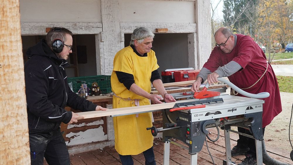 Seit Mitte September 2021 sind sie zugange: Drei Mitglieder des Arbeitskreises Gallo-römisches Leben Lahr-Dinglingen fertigen jeden Freitagnachmittag auf der Römeranlage im Lahrer Bürgerpark ehrenamtlich Möbel aus Erlenholz an.