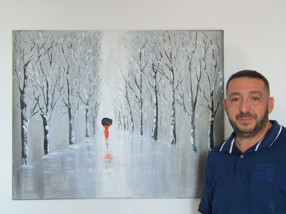 Zu sehen ist der Lahrer Künstler Hakim Azzaz neben seinem Ölgemälde. Dies zeigt eine schneebedeckte Allee, auf der eine Frau in einem Roten Kleid und mit schwarzem Regenschirm geht.