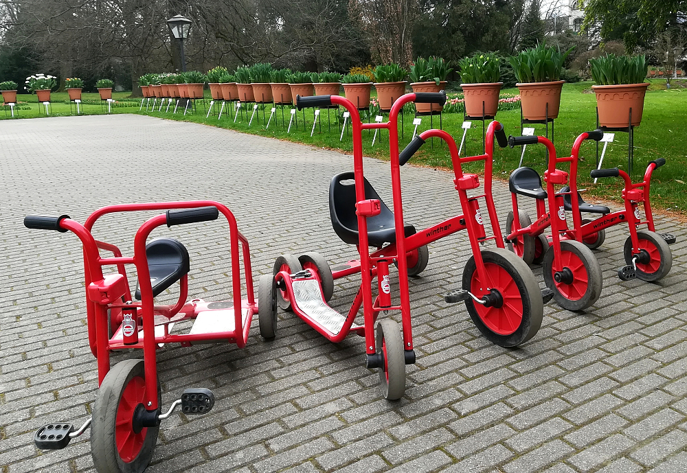 Auf dem Bild stehen Dreirad, Roller und Laufrad in rot aufgereit nebeneinander. Im Hintergrund sieht man Küpel mit noch nicht erblühten Tulpen.