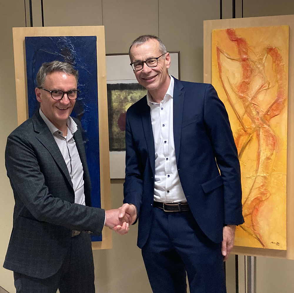Markus Ibert (links), Oberbürgermeister der Stadt Lahr und Aufsichtsratsvorsitzender des E-Werks Mittelbaden, gratuliert Bernhard Palm zur Ernennung als neuer Vorstand im E-Werk Mittelbaden.