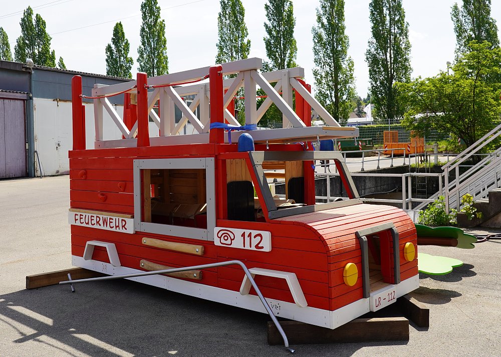 In den nächsten Tagen geht es um den Aufenthaltsbereich am Rathausplatz. Die vorhandenen Spielelemente aus Edelstahl werden durch ein Feuerwehrauto aus Robinienholz mit verschiedenen Aufstiegen und einer Rutsche ersetzt. Gleich nebenan befindet sich die „echte“ Feuerwehr der Stadt Lahr. „Die Kinder können sich also schon einmal in unmittelbarer Nähe zu ‚den Großen‘ als Feuerwehrleute ausprobieren“, freut sich Christina Volz, von der Abteilung Öffentliches Grün und Umwelt, die für die Spielplätze in der Stadt verantwortlich ist.
