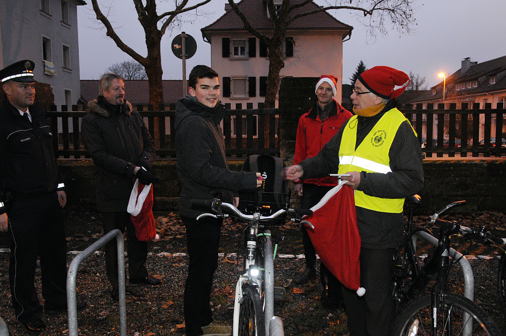 Weitere Unterstützung erhielt der Nikolaus durch Helmut Schönberger vom ADFC Ortenaukreis sowie durch die Lahrer Polizei, die den Fahrradcheck durchführte und auf eine ordnungsgemäße Fahrradbeleuchtung hinwies. Zur Feier des Tages verzichtete die Polizei ausnahmsweise darauf, bei vorgefundenen Mängeln ein Bußgeld zu erheben.