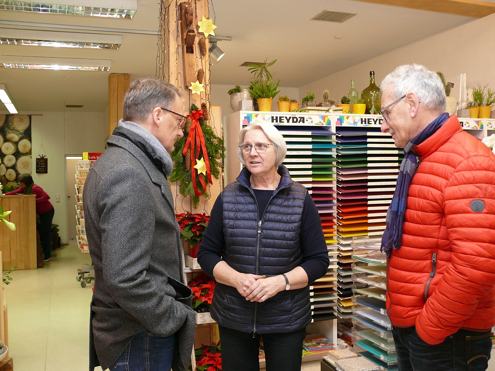 Das Bild zeigt zwei Männer und eine Frau, die im Gespräch in einem Geschäft sind. Bei den beiden Männern handelt es sich um Oberbürgermeister Ibert und Ortsvorsteher Girstl, die Frau ist Geschäftsinhaberin Fleig
