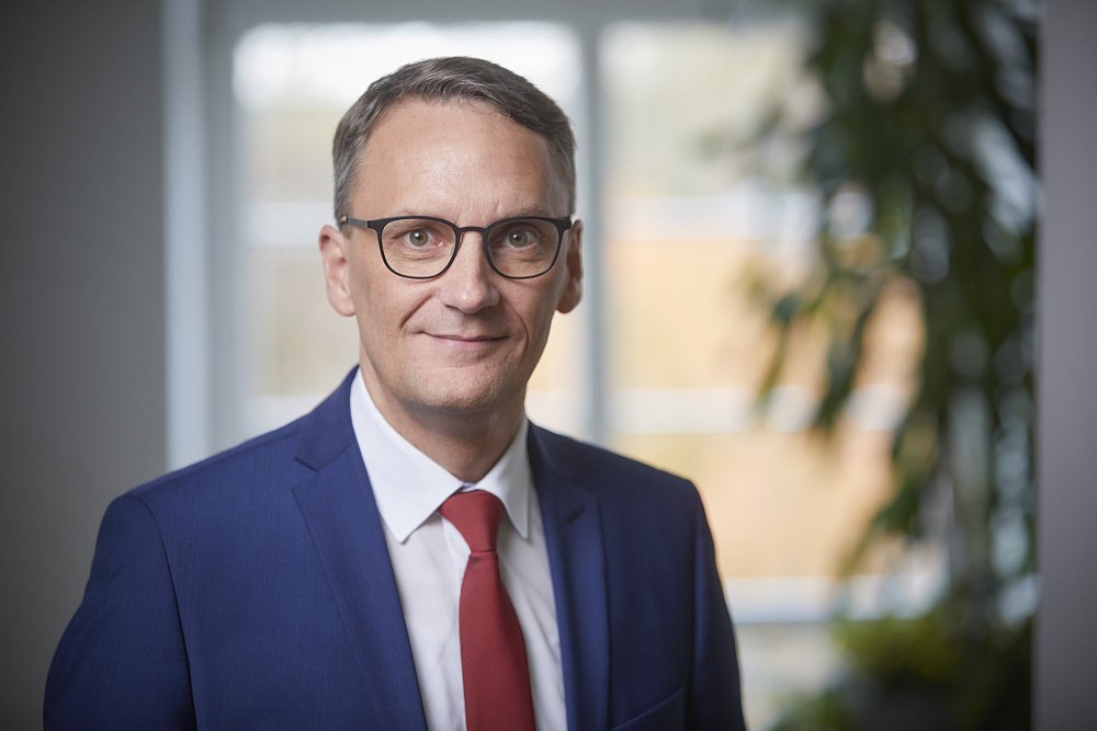Portraitbild quer von Oberbürgermeister Markus Ibert. Er trägt ein blaues Jacket, ein weißes Hemd und eine dunkelrote Krawatte.