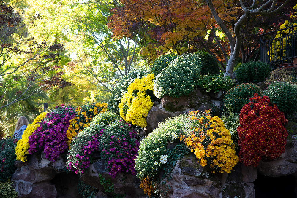 Leuchtende Chrysanthemen zieren die abgeräumten Dahlienbeete und das Knotenbeet. Auch die Villa Jamm und die Grotte sind floral geschmückt. Mit etwas Glück kann ein beeindruckendes, gärtnerisches Highlight, der „Ozukuri“, im Musikpavillon bewundert werden. Bei dieser speziellen Kulturform entstehen überdimensional große Chrysanthemen-Pflanzen mit Dutzenden Einzelblüten. Im Nationalgarten von Tokio, dem „Shinjuku Gyoen“, wurden bereits Pflanzen mit 1000 Einzelblüten kultiviert. Dies brachte dieser besonderen Chrysanthemen-Wuchsform auch den Namen „Tausendblüter“ ein. In Deutschland ist der Ozukuri ein einmaliges Ausstellungsstück. Mit viel Fingerspitzengefühl wird jeder der Pflanzentriebe mehrfach gebunden und positioniert, um optimale Lichtverhältnisse zu garantieren.