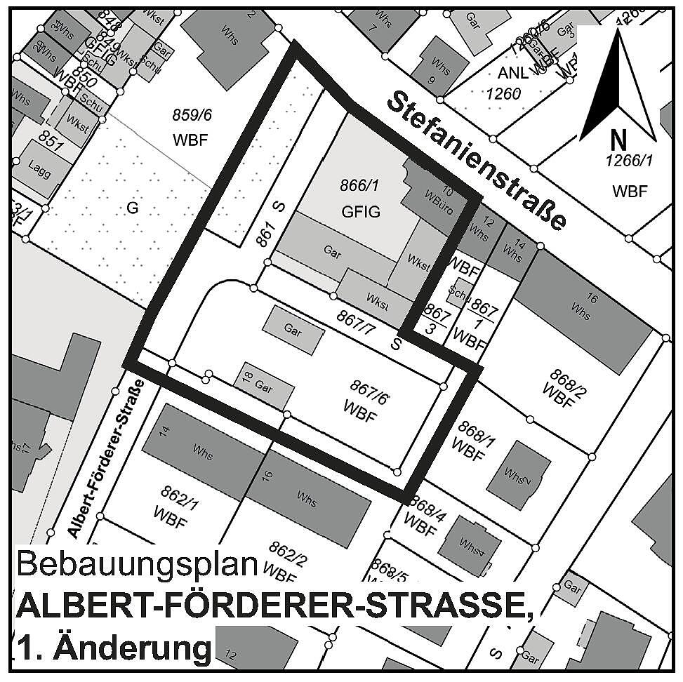 Man sieht hier den Geltungsbereich des Bebauungsplans Albert-Förderer-Straße, erste Änderung