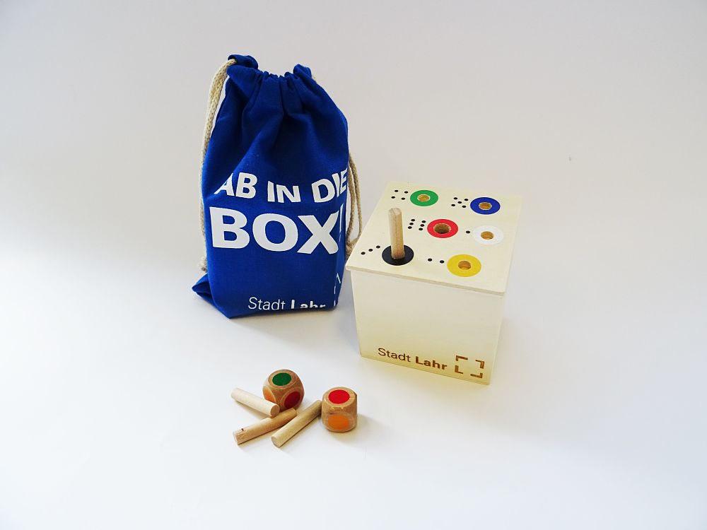 „Ab in die Box“ ist ein Spielklassiker für die ganze Familie, bei dem die zugeteilten Holzstäbchen in der Box verschwinden müssen. Das beliebte Würfelspiel regt spielerisch zum Farben erkennen und Rechnen an. Es ist für zwei bis sechs Spieler ab vier Jahre geeignet. Das Holzspiel wurde über die Lahrer Firma Sauer in Auftrag gegeben. Schön und praktisch verpackt in einem Baumwollbeutel ist „Ab in die Box“ für 8,90 Euro im KulTourBüro erhältlich. Beide Spiele können auch im Online-Shop der Stadt Lahr erworben werden.