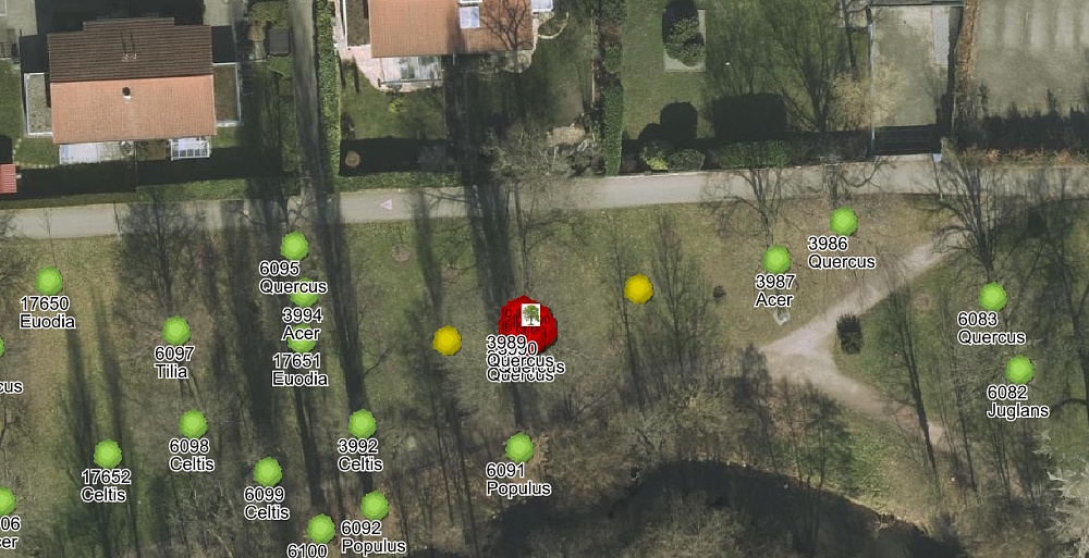 Ausschnitt aus dem Geoportal der Stadt Lahr mit dem Standorte der zu fällenden Eiche (rot) und der geplanten Jungbäume (gelb)