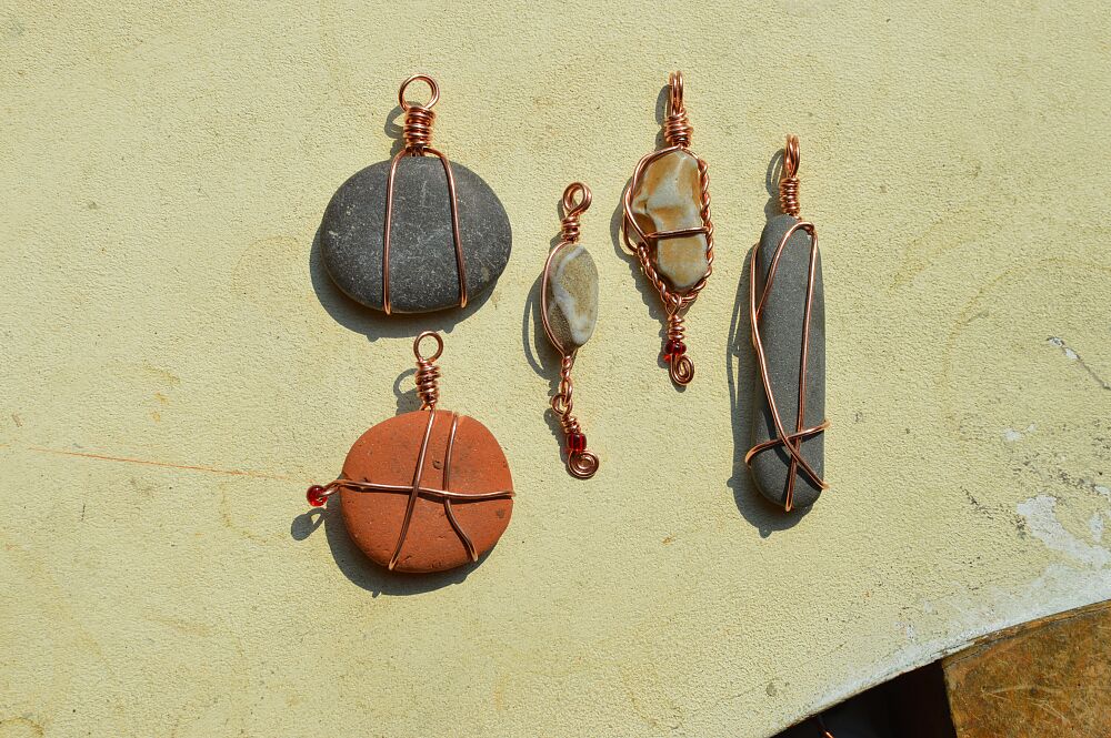 Schmuckworkshop: Schöne Kiesel werden mit buntem Draht als Anhänger eingefasst
